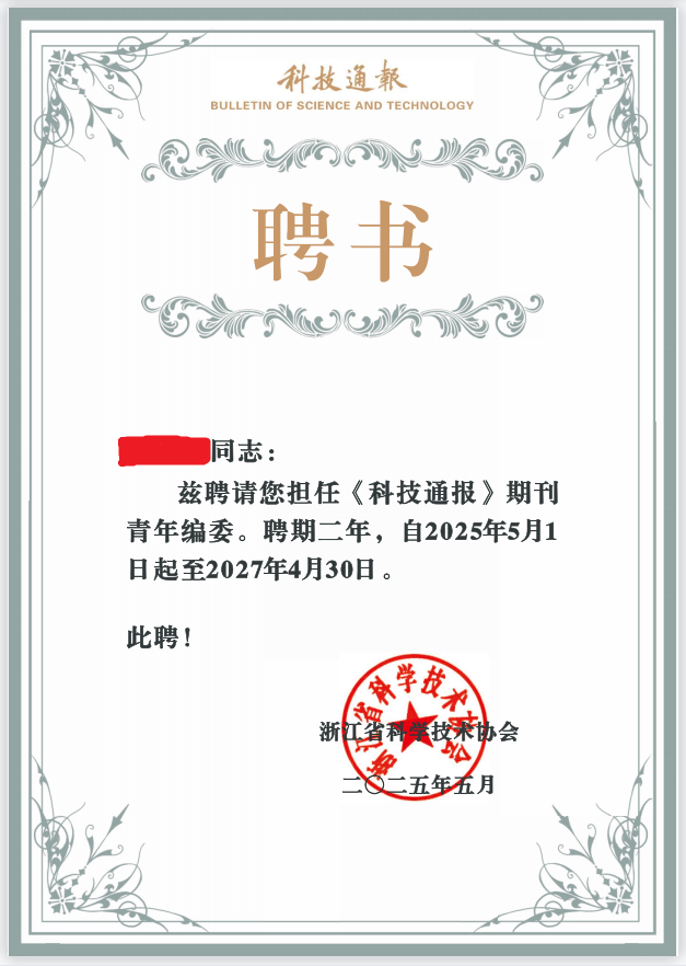 近日,《科技通报》编辑部向首批青年编委发出聘书,我司3名学术顾问被正式聘任为《科技通报》青年编委,聘期2年,自2025年5月1日至2027年4月30日。